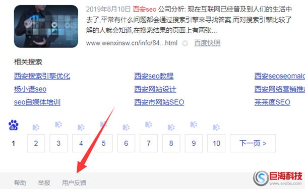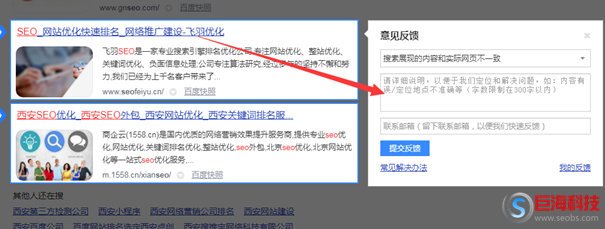 西安優(yōu)化公司仔細(xì)閱讀了下百度的建議了解到,原入口雖然不能用,但用戶可以通過百度搜索引擎頁(yè)面底部的“用戶反饋”進(jìn)行提交處理。于是試了下手頭上要處理的站點(diǎn),果然反饋成功了,不過這種方法處理的周期較長(zhǎng),一般1~2周不等。如下圖示范: