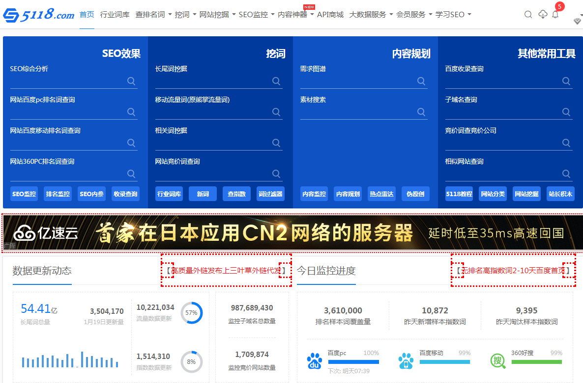 5118是一款SEO關(guān)鍵詞工具,專門做營銷型網(wǎng)站等各類SEO網(wǎng)站關(guān)鍵詞分析的,分為長尾詞庫、競(jìng)價(jià)詞庫、熱門關(guān)鍵詞庫、行業(yè)關(guān)鍵詞庫以及網(wǎng)站詞庫等,還能預(yù)測(cè)熱門關(guān)鍵詞以及網(wǎng)站綜合分析等